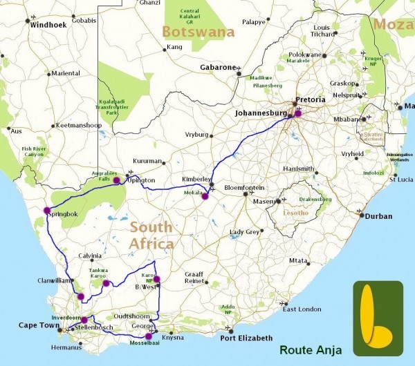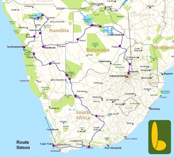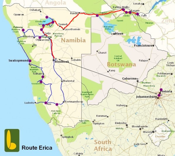 Let op: Vanwege de enorme regens is de reis van Erica veranderd en is ze via Etosha naar het noorden via Caprivi, Kasane (Chobe) en uiteindelijk Victoria Falls gereden (zie rode lijn).